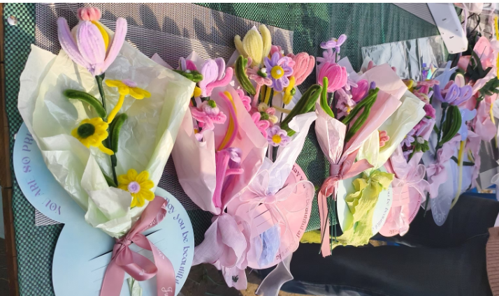 而在手工制作区,女神们灵巧地将五彩斑斓的扭扭棒缠绕、弯曲,巧妙地编织出一朵朵栩栩如生、色彩斑斓的花朵,每一片“花瓣”都洋溢着创意与童趣。